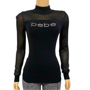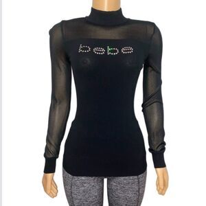 COPY - NWT Bebe Rhinestone Logo Mock Neck Sweater w / Sexy Mesh Long Sleeve Bla…