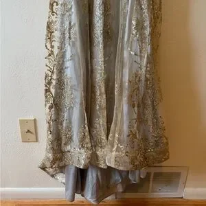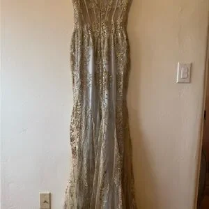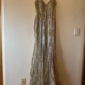 Glitter Print Mermaid Dress by Cinderella Divine J810, size 4. Dress is overall in great condition EXCEPT the base of the dress has significant (light colored) stains and spilling. Photo included, sold as is.