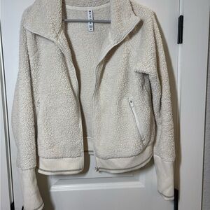 This zip-up Athleta sweater is a cozy, cream-colored fleece jacket with a soft, textured exterior. It features a full-length front zipper, two side pockets with zippers, and ribbed cuffs and hem for a snug fit. The design includes a high collar and a lightweight, plush material, making it ideal for casual wear or layering in cooler weather.