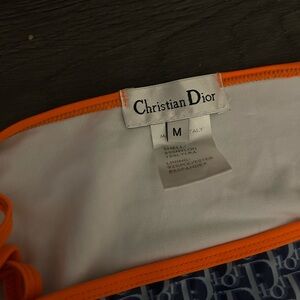 Stylish Dior bikini with navy pattern and vibrant orange accents. Perfect for summer days.