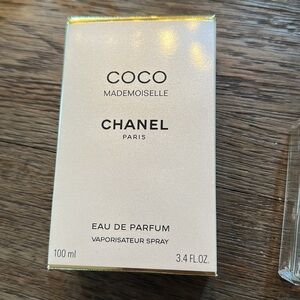 CHANEL Coco Mademoiselle Eau de Parfum. Luxurious scent with gold detailing. Ideal for sophisticated wear. Empty bottle with box and bag.
