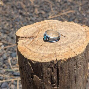 A beautiful Navajo ring with traditional design. Made of sterling silver with turquoise stones. Handmade by Navajo artisan Paul Largo, signed "Sterling". Traditional tribal artwork, intricate details. Collectible quality Native American jewelry.