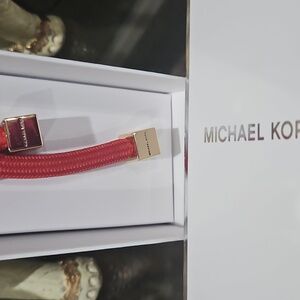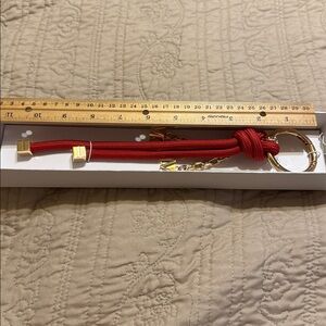 Elegant keychain with red rope and gold accents. Features a stylish knot and gold charms.