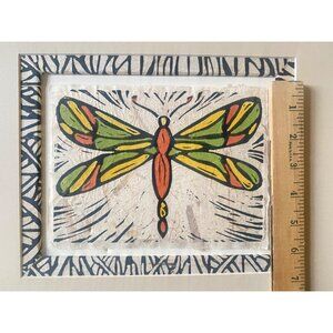This stunning handmade artwork by artist John Davis features a vibrant dragonfly design created using a block print technique. Expertly crafted on textured paper and matted to a total size of 8 x 10 inches, it is framed with a striking patterned border for added visual appeal. This unique piece is excellent for colorful, creative spaces. Minor wear visible on the matted edges, but it doesn't detract from the artwork.