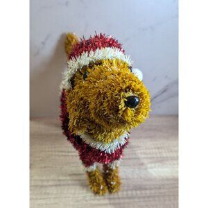 This delightful tinsel dog dressed in a Santa outfit is here to spread holiday cheer with a wag and a woof. Perfect for adding a touch of whimsy to your seasonal decor, it stands adorably on your mantel or table. Let this furry friend be your holiday sidekick.