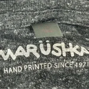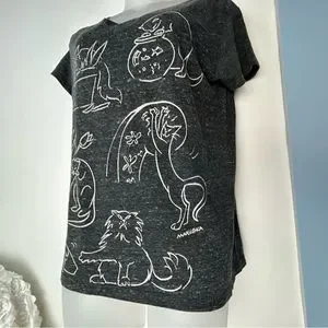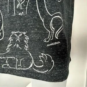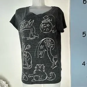 Marushka Gray Heathered Cat Antics T-shirt Small. 19" across chest, 25" long, cotton blend. Wear on tag faded. Used, pre-owned in good condition.