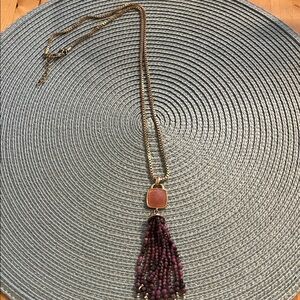 Bold statement necklace with matching earrings. Features gold and purple accents. Perfect for adding a pop of color.