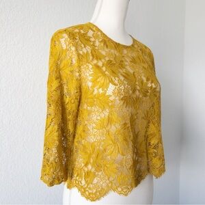 Zara mustard yellow sheer lace blouse featuring an allover floral design, scalloped hem, and 3/4 sleeves. Keyhole button closure at the back. Beautiful statement piece for layering over camisoles, bralettes, or dresses.