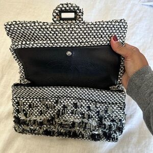 Stunning CHANEL tweed reissue bag. It’s a blend of black, white, gold, and silver. Hardware is gunmetal.