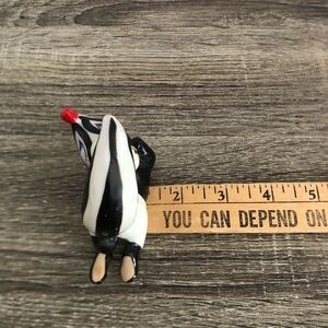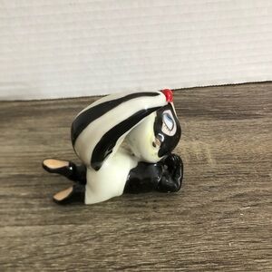 Charming skunk figurine in black and white with a lovely red nose. He is wearing a pair of white shorts with an orange and green pattern. Perfect for collectors. I believe this may have been made as a product for Disney as I have found similar skunks with patched bottoms listed. Note: not marked Disney, just “Japan”.