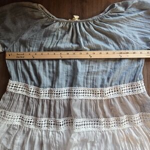 Boho Blue and White And Gray Gauze Blouse With Lace Detail Bell 3/4 Sleeves