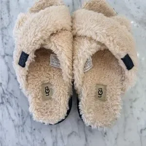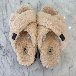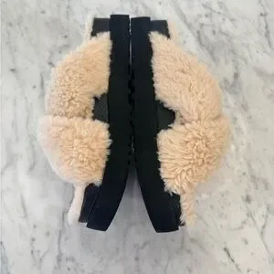 NEW UGG Fuzz Sugar Cross Slides Cream Fuzzy Wool Slippers Women’s Size 9