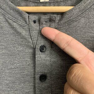 This shirt is missing the top button. This Lululemon men's shirt is a versatile and stylish addition to any wardrobe. The small grey button-up tee features a solid pattern with long sleeves and a Henley neckline for a classic look.