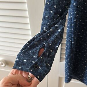 Chic and polished Jasmine & Juliana tie-neck dress in size 4 — the perfect elevated piece for work, presentations, business dinners, and conferences. Features a self-tie neckline, long sleeves, and a comfortable shift silhouette with a subtle navy + white dotted print. Easy to dress up with heels or down with flats or boots.
