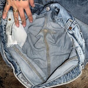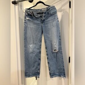 High rise baggy boyfriend. 28 waist. 27in inseam. Light wear and hems. Mildly stiff. Lite stretch