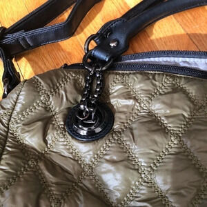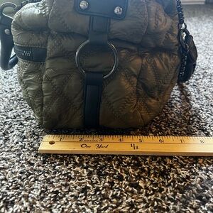 Army green crossbody bag with adjustable strap. This bag is 100%nylon lined with 100% cotton grey fabric. Multiple pockets on the inside of this bag with zippers. In excellent condition