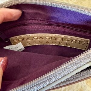 In Like New condition! Tan and grey faux leather wristlet. Zip top closure, interior zip pocket, exterior zip pocket. Wrist strap. Silvertone hardware. Measures about 8” X 6”.