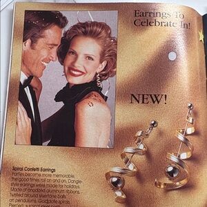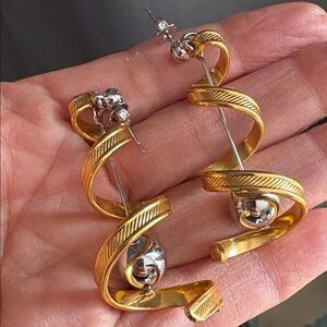 These beautiful vintage 1995 Avon dangle earrings feature an eye-catching spiral design in rich gold-tone metal, accented with polished silver-tone beads for striking contrast. The sculptural, ribbon-like curves create movement and shine, giving these earrings a bold yet elegant look.