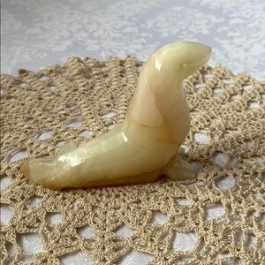 Vintage 1970 Elegant onyx carved stone seal figurine. Features cream & brown hues. This figurine is made from Onyx, a natural stone known for its unique veined patterns & durability. It is a popular type of collectible animal figurine often associated with vintage items. The carving style is typically production quality, meaning the focuses on the general shape rather than the fine intricate details. Purchased in Niagara Falls. 4” height & 4.5” length. In mint condition. Smoke & pet free home.