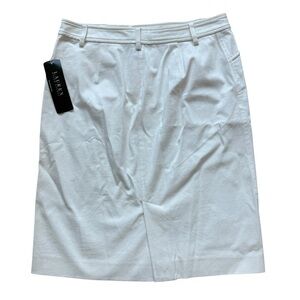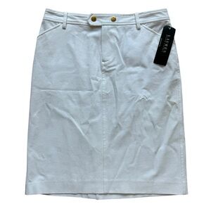 Keywords: Lauren Ralph Lauren, A-Line skirt, knee-length, white stretch, casual wear, semi-formal, zip-front closure, belt loops, machine washable, new with tags.