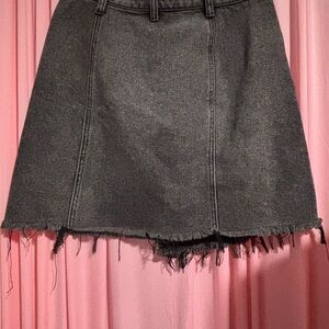 Chic charcoal mini skirt with unique asymmetrical cut. Features frayed hem and classic pocket design. Ideal for casual outings.
