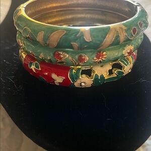 Elegant floral enamel bangles featuring vibrant green and red hues. Perfect for adding a touch of color to any outfit. Looks like Cloisonné but not sure if it is. It’s definitely enameled though. In excellent condition.