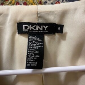 Stylish DKNY blazer with intricate red and cream patterns. Perfect for a chic, bold look.