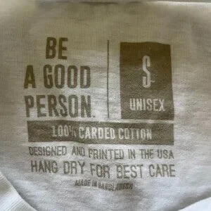 The shirt is a long-sleeve "Be A Good Person" shirt from the apparel brand with the same name. The Denver, Colorado-based company was founded with the mission to spread positivity through fashion and community engagement.