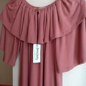 A soft jersey Rachel Pally Kylian dress with covered elastic at the off shoulder neckline. Short flared sleeves. Unlined.