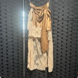 Chic asymmetrical design with a brown satin wrap. Cream lace adds elegance. Ideal for stylish occasions.size 2 USA 6-8