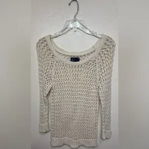 American Eagle cream colored open knit sweater. Size M, is fitted so does not have much stretch. Like new condition! Would be beautiful over a cami or other tank.