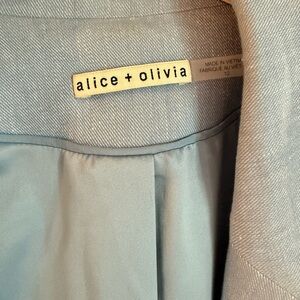 Chic sky blue blazer by Alice + Olivia. Tailored fit with classic lapels. Ideal for professional or casual wear.