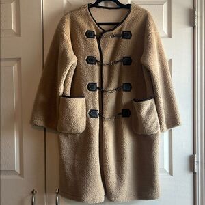Stay warm and stylish with this cozy tan toggle coat. Perfect for chilly days, this coat combines comfort and fashion effortlessly.
