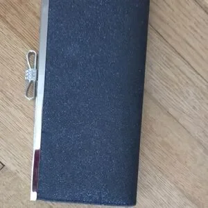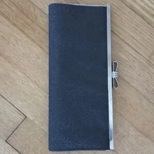 Elegant black clutch with silver accents. Features a sleek design and bow detail.