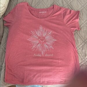 Two short sleeve lucky brand T-shirts size large. 50% polyester 37% cotton and 13% rayon. One is a navy blue texture and one is pink.
