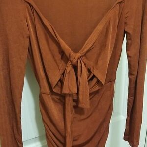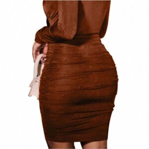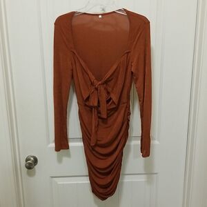 Coffee Long Sleeve Halter V-Neck Silk Bodycon Mini Dress sz Medium