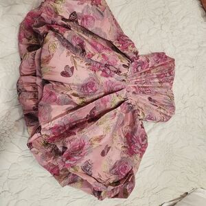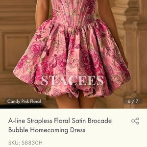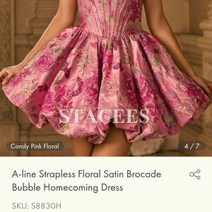 Step into elegance and charm with this beautiful pink floral brocade homecoming dress. Featuring a flattering strapless design, the dress is adorned with delicate floral patterns and metallic accents that add a touch of sophistication. The bodice is expertly structured with a flattering, corset-inspired design and a graceful, slightly scooped strapless neckline that showcases the shoulders and collarbone. A fitted waist gives way to a voluminous, pleated skirt, creating a playful and feminine silhouette with plenty of movement, while the voluminous bubble skirt gives the dress a playful and feminine flare. The back of the dress mirrors the front with its seamless strapless construction, emphasizing its romantic charm and refined tailoring. Perfect for formal events, dances, or any special occasion, this dress combines timeless floral beauty with a touch of modern glamour.