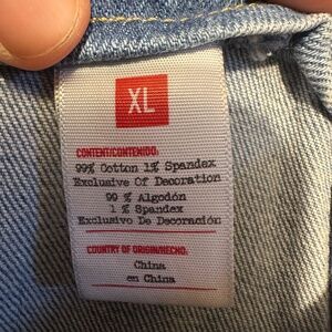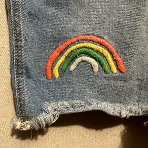 Take Pride (Target) Rainbow Strap Denim Overalls in a light wash. Unfinished hem at leg. Front and back pockets with one large pocket at the chest. Adjustable straps. 3 buttons at the sides. Perfect romper for pride month! "Queen" embroidered at the top with a rainbow embroidered on the bottom right leg. Size XL.