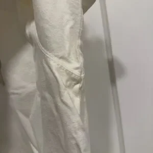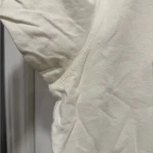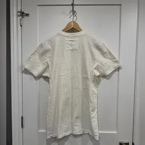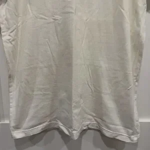 Gently worn once or twice, could not find any sign of wear, lined dry to avoid dryer shrinkage. Stylish cream t-shirt with bold graphic logo sewn on. Comfortable and casual design. Nice thick cotton, muscle fit for a casual upscale look.
