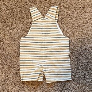 Charming overalls with tan and white stripes. Ideal for active kids.
