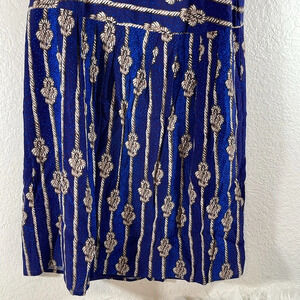 The dress is blue with brown and white rope/knot print. It is sleeveless in an A-line style with pockets.