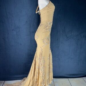 Shine in this elegant gold evening gown, perfect for special occasions. The intricate detailing adds a touch of sophistication.