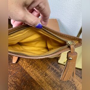 Genuine vintage ISABELLA FIORE tan leather crossbody shoulder bag tassel.