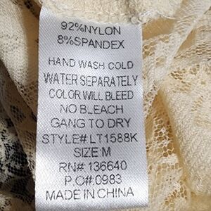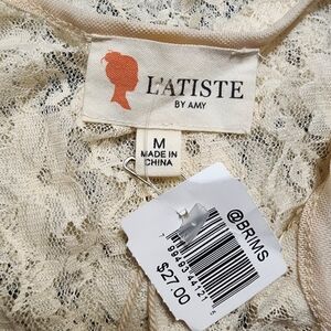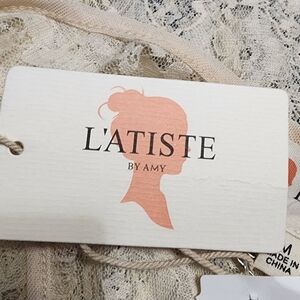 L'Atiste by Amy bodysuit, size medium, new with tags. The bodysuit is made of 92% nylon and 8% spandex. Features wide straps, a sleeveless design, and snap closures at the bottom. Sheer construction with beaded and floral lace detailing. Hand wash cold and hang to dry.
