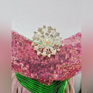Elegant dress featuring a sequin top and a vibrant green sash. The skirt has a beautiful purple tulle overlay. In the pictures I stuck the pin that comes with the dress in the middle of the top of dress. But I believe it is meant to go in the middle of the sash. I left the pictures as they were because it was easier to see as it was just for photographing purposes. This dress also comes with straps, see pictures, that are detachable, if you prefer to use them.