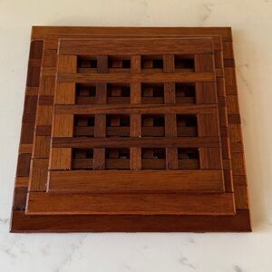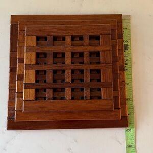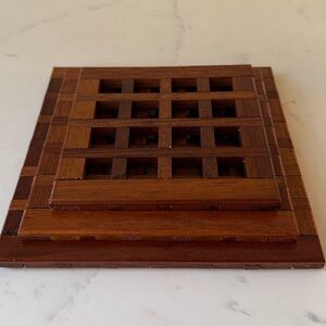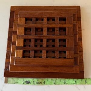 Excellent vintage condition. Clean and smoke free these guys stack perfectly. There are a couple of places where the wood is fraying, as shown. Please see photos for measurements. No makers mark.