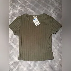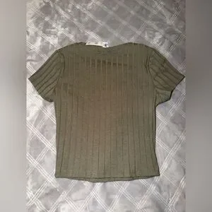Chic olive ribbed tee. Short sleeves for a casual look. Perfect for everyday wear.