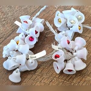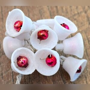 48 vintage wired mica dusted sugar bells with mercury glass centers from Japan, each measuring approximately 5/8" x 5/8". Perfect for vintage assemblages, wreaths or other craft projects.
