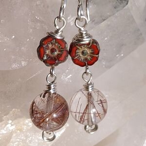 Rare Red Rutilated Quartz Gems Dangle Beneath Vintage Red Czech Glass Flowers.