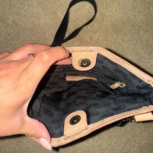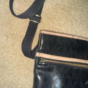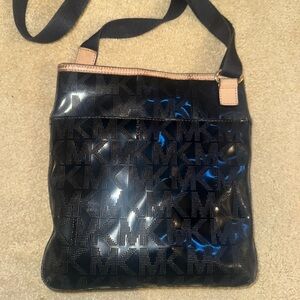 Glossy black finish with signature MK pattern. Adjustable strap. Front zipper pocket. Used as shown in the photo.